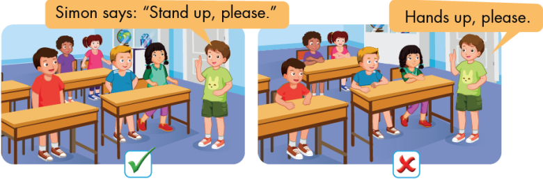 Bạn quản trò yêu cầu cả lớp đứng lên : “Simon says: Stand up, please.”, các bạn đứng lên.