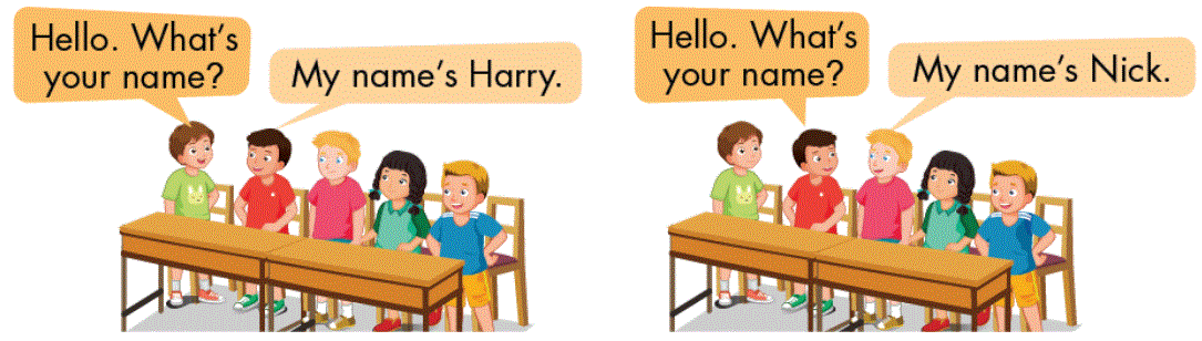 Cách chơi: Bắt đầu trò chơi, người thứ nhất sẽ hỏi tên: “ Hello. What’s your name?”. Người thứ 2 sẽ trả lời: “My name’s Harry.” và hỏi cho người thứ 3: “Hello. What’s your name?”. Người thứ 3 sẽ trả lời: “My name’s Nick.” và tiếp tục hỏi tên người thứ 4. Mỗi bạn sẽ lần lượt trả lời và hỏi tên bạn kế bên mình cho đến khi nào hết lượt.