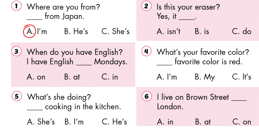 Grammar 3. Read and circle. Communication 4. Read and match. Listening 5. Listen and circle. Reading and writing 6. Look, read, and fill the blanks.