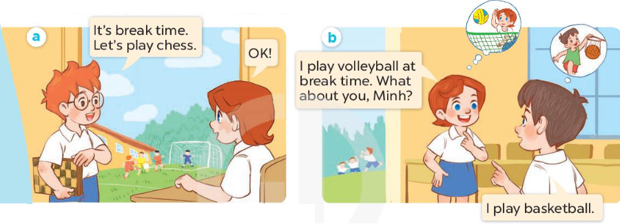(Mình chơi bóng chuyền vào giờ giải lao. Còn bạn thì sao, Minh?)