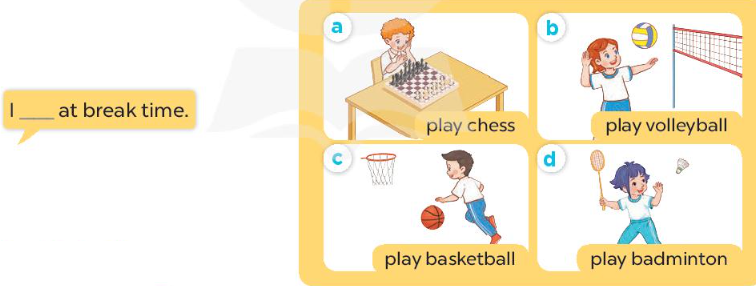 I play badminton at break time. (Tôi chơi cầu lông vào giờ giải lao.)