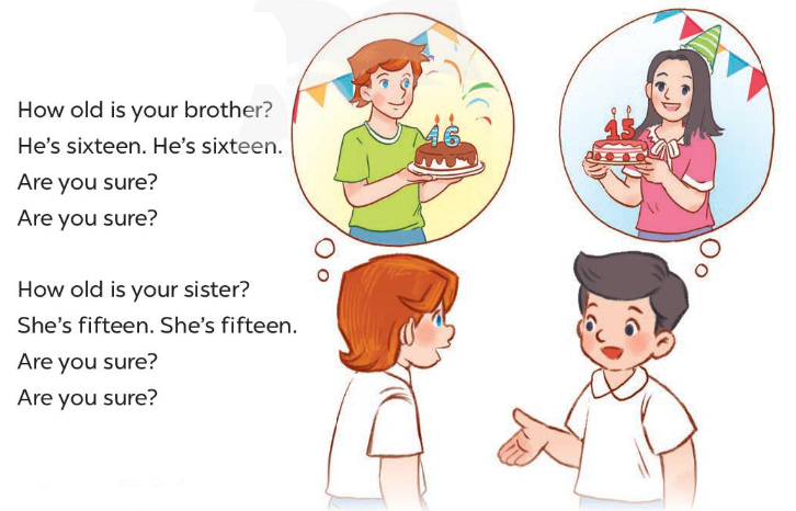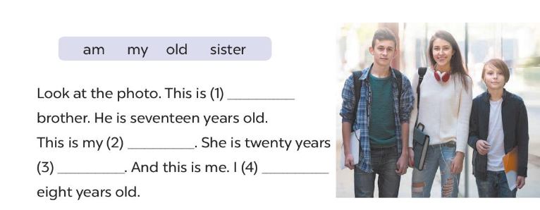 Look at the photo. This is (1) my brother. He’s (2) seventeen years old. This is my (3) sister. She’s twenty years (4) old. And this is me. (5) I’m eight years old.