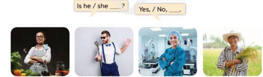 Cách chơi: Giáo viên sẽ giơ bất kì tấm thẻ nào có chứa hình ảnh về môt nghề nghiệp. Giáo viên sẽ đặt câu hỏi yes-no question “Is he/she ___?”. Nếu đúng học sinh sẽ vỗ tay và nói “Yes,__”, sai thì không cần vỗ.