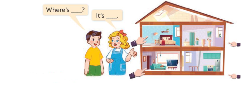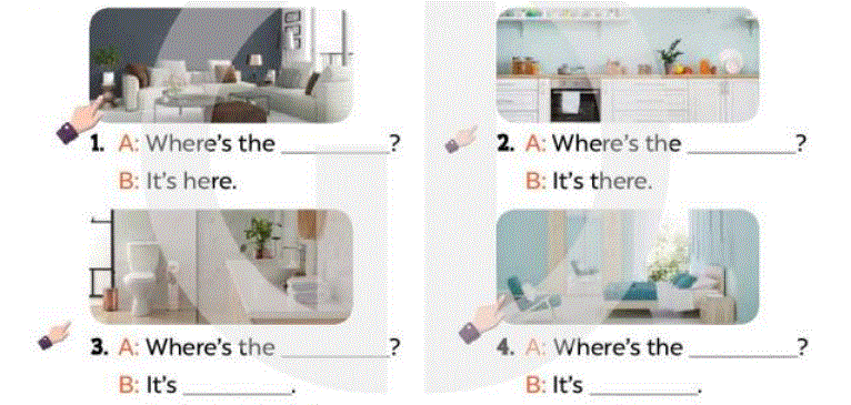 1. A: Where’s the living room? (Phòng khách ở đâu?)