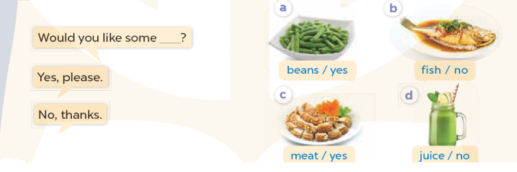 No, thanks. (Không, cám ơn.)c. Would you like some meat? (Bạn có muốn một ít thịt không?)