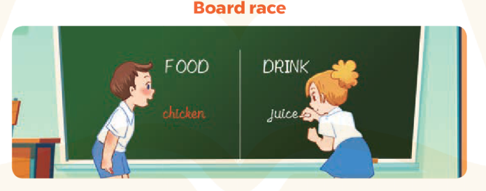 Cách chơi: Giáo viên sẽ chia lớpthành 2 đội (có thể 3, 4 đội tùy số lượng học sinh), mỗi đội chơi sẽ đứng xếp thành hàng. Sau đó giáo viên sẽ chia bảng làm 2 và viết chủ đề lên đầu bảng mỗi nhóm. Khi trò chơi bắt đầu, mỗi lần một người chơi chỉ được viết 1 từ, sau đó chạy về chuyền phấn cho người tiếp theo và đứng xuống cuối hàng. Cứ lần lượt như vậy cho đến khi hoàn thành hoặc giáo viên hô hết thời gian.