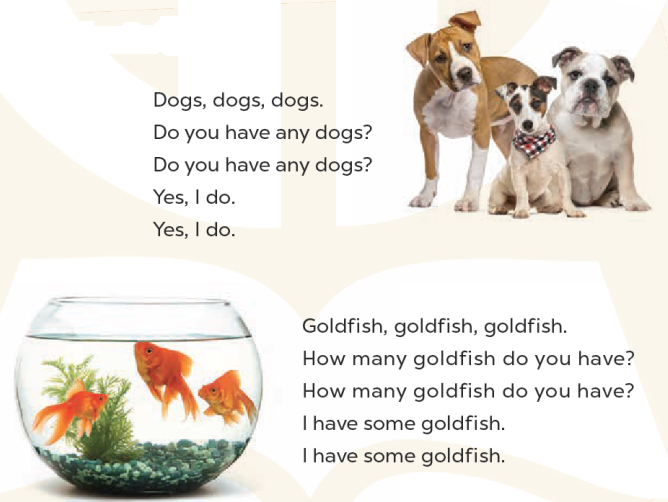 Hi. My name’s Mary. I have (1) many pets in my house. I (2) have twenty goldfish, four parrots (3) and some cats. How many pets (4) do you have?