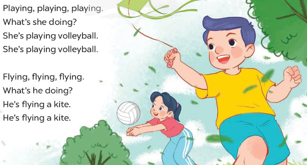 Lucy and Nam are my friends. They like sports and games. Lucy is playing volleyball. Nam is playing football. I like skipping. I'm skipping. What are you doing?