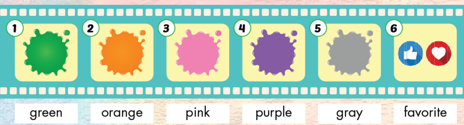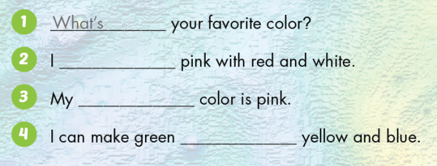 A. 1. Listen and point. Repeat. 2. Play Slow motion B. 1. Listen and practice. 2. Fill in the blanks. Practice. C. 1. Read and fill in the blanks. 2. Fill in the blanks. D. 1. Look and listen. 2. Listen and write. 3. Practice with your friends. E. 1. Read and circle True or False. 2. Circle Minh's favorite color. F. Look at E. Write about your favorite color. G. Tell your friends about your favorite color.
