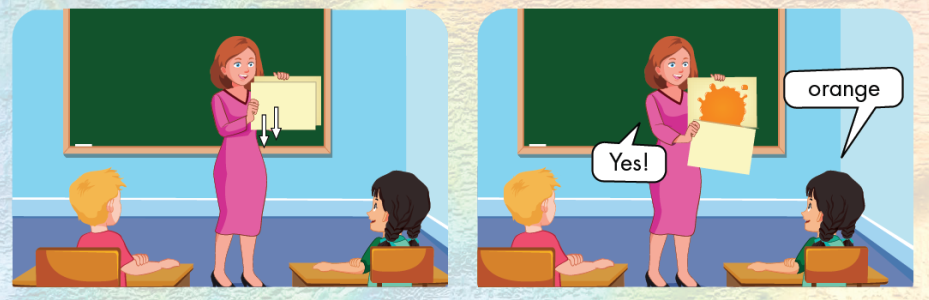 Ví dụ: Cô sẽ mở từ từ cho các bạn nhìn thấy hình có màu cam, các bạn dưới lớp phải đoán nhanh đó là ”orange”