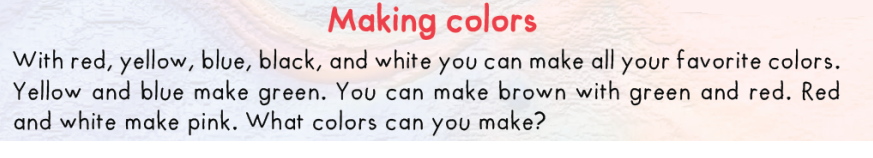 With red, yellow, blue, black, and white you can make all your favorite colors. Yellow and blue make green. You can make brown with green and red. Red and white make pink. What colors can you make?