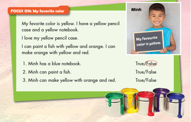 (Màu yêu thích của tôi là màu vàng. Tôi có một hộp bút màu vàng và quyển vở màu vàng. Tôi yêu quý hôp bút màu vàng của mình. Tôi có thể vẽ con cá bằng cọ màu vàng và màu cam. Tôi có thể làm ra màu cam bằng màu vàng và màu đỏ.)