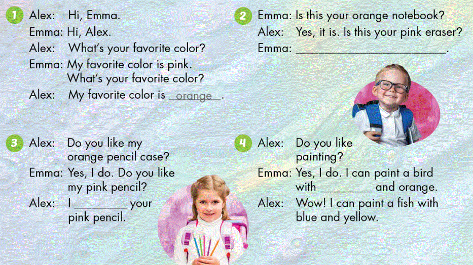 Emma: My favorite color is pink. What's your favorite color? (Màu yêu thích của tớ là màu hồng. Thế màu yêu thích của cậu là gì?)