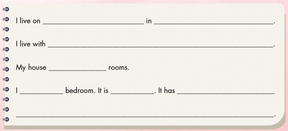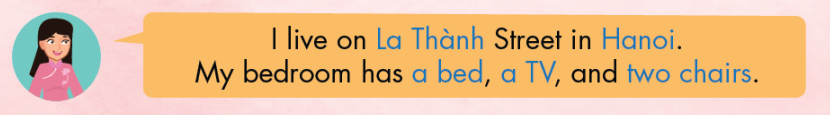 (Tôi sống ở đường Hoàng Văn Thụ, Đà Lạt. Tôi sống với mẹ và bố của tôi. Nhà của tôi có 8 phòng. Tôi yêu quý phòng ngủ của mình. Nó màu hồng. Nó có một cái giường, một cái bàn học, và một tủ quần áo.)