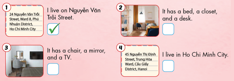 1. I live on Nguyễn Văn Trỗi Street. √ (Tôi sống ở đường Nguyễn Văn Trỗi. √)