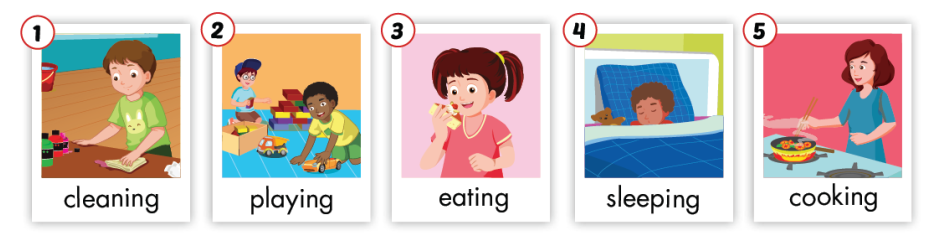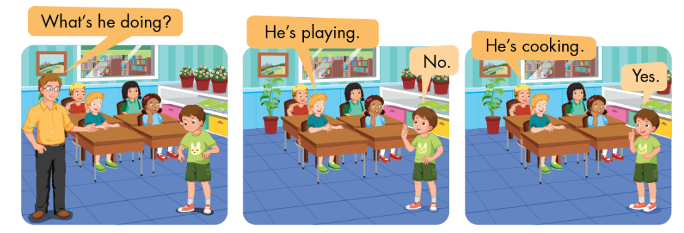 Ví dụ: Một bạn sẽ dùng hành động để diễn tả bạn đang nấu ăn. Giáo viên điểu khiển trò chơi sẽ hỏi “What’s he doing?”, các bạn dưới lớp sẽ đoán: “He’s playing.” hoặc “He’s cooking.”…