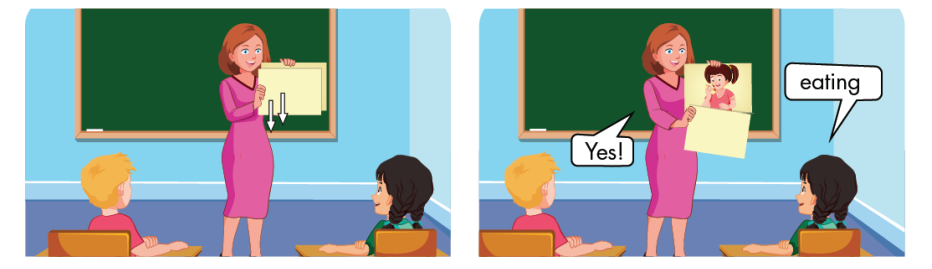 Ví dụ: Cô sẽ mở từ từ cho các bạn nhìn thấy bức tranh về một bạn đang ăn, các bạn dưới lớp phải đoán nhanh đó là ”eating”.