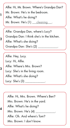 Mr. Brown: He's (1) cleaning. (Ông ấy đang quét dọn.)