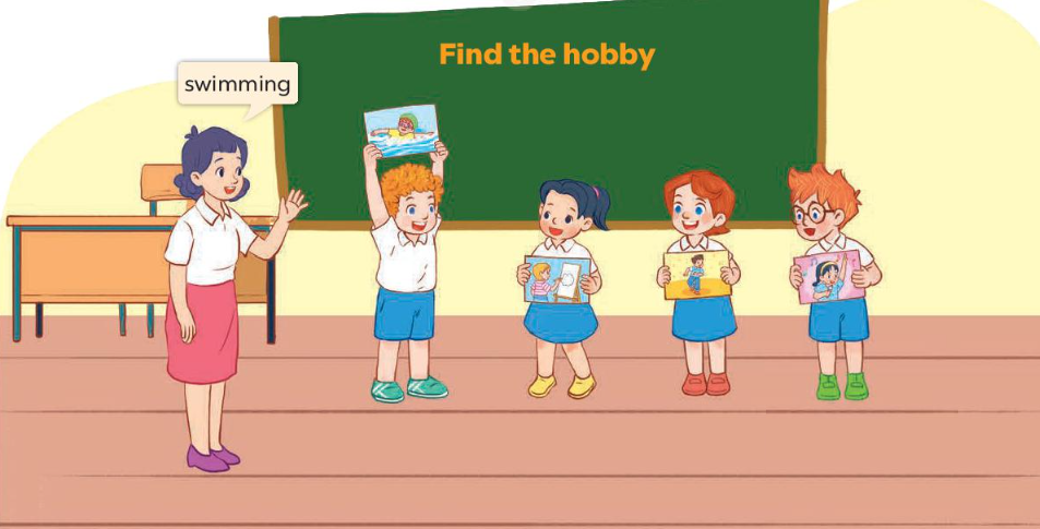 Cách chơi: Mỗi bạn sẽ cầm lấy 1 tấm thẻ với từng sở thích khác nhau, ví dụ: swimming, drawing, dancing, singing. Khi cô đọc lên 1 sở thích bất kì thì bạn cầm tấm thẻ với sở thích đó phải giơ lên cao cho các bạn khác thấy. Ví dụ, cô giáo đọc “swimming”, bạn trai giơ cao thẻ với hình ảnh hoạt động bơi lội “swimming”.