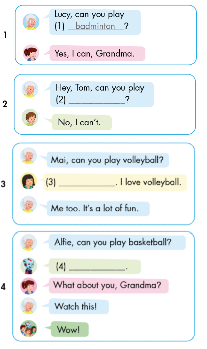 1. Lucy, can you play (1) badminton? (Lucy, cháu co thể chơi cầu lông không?)