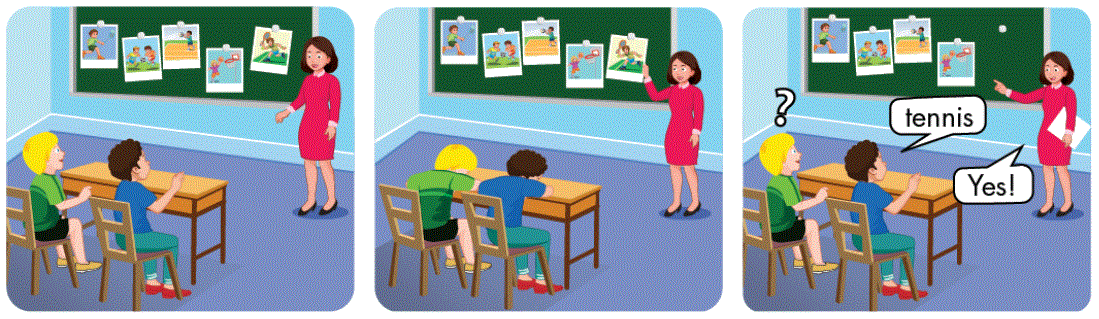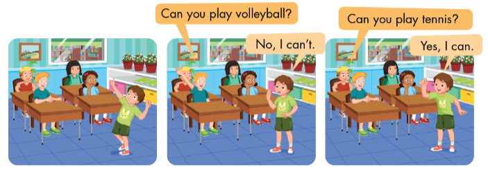 Một bạn sẽ dùng hành động để diễn tả chơi quần vợt, các bạn dưới lớp sẽ đặt câu hỏi: “Can you play tennis? Nếu đúng, người diễn tả sẽ nói “Yes, I can.”, sai thì nói “No, I can’t.”