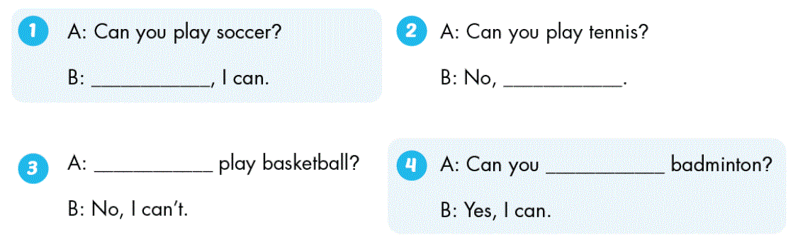 4. A: Can you play badminton? (Bạn có thể chơi cầu lông không?)