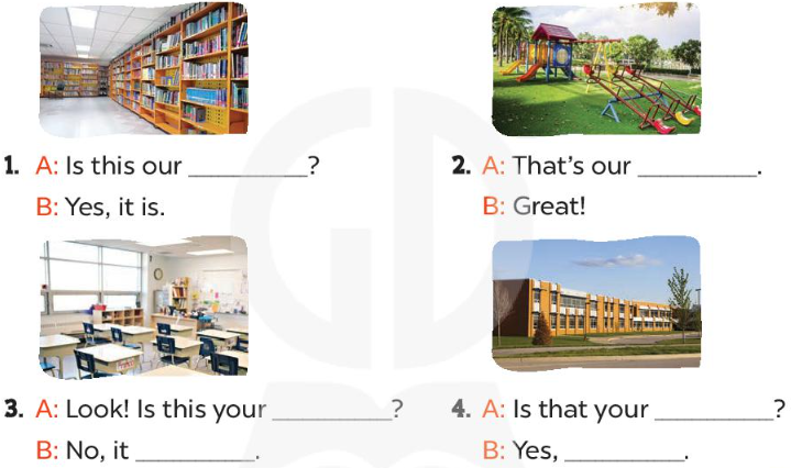 1. A: Is this our library? (Đây có phải thư viện của chúng ta không?)