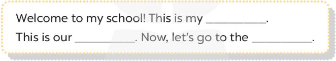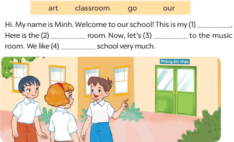 Hi. My name’s Minh. Welcome to our school! This is my (1) classroom. Now, let’s (2) go to the music room. Here is the (3) art room. We like (4) our school very much.