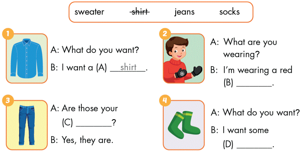 B: I want a (A) shirt. (Tôi muốn một cái áo sơ mi.)