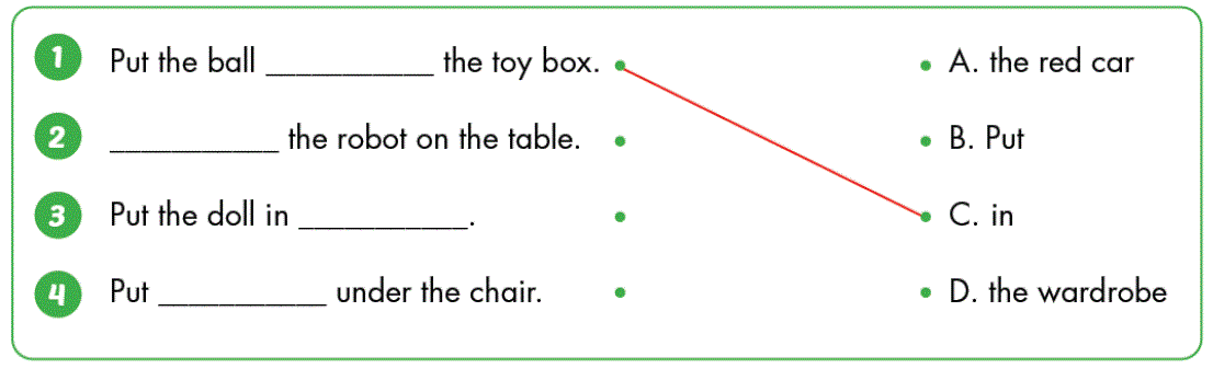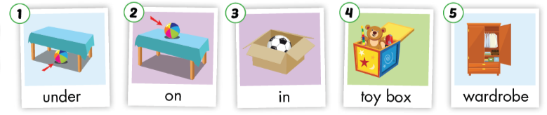 1. Put the ball in the toy box. (Đặt quả bóng vào hộp đồ chơi.)