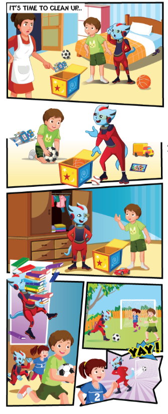 2. Put the robot in the toy box. (Đặt con người máy vào trong hộp đồ chơi.)
