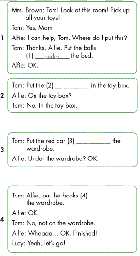 Tom: Thanks, Alfie. Put the balls (1) under the bed. (Cảm ơn Alfie. Để những quả bóng dưới chiếc giường nhé.)