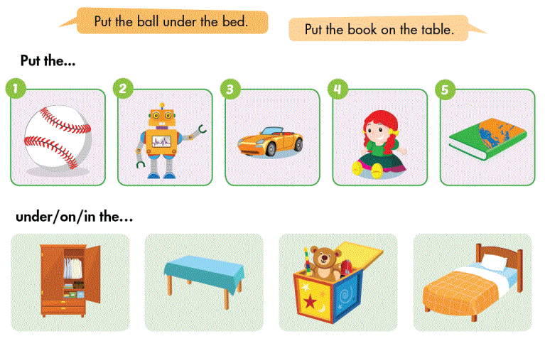 1. Put the ball under the bed. (Đặt quả bóng ở dưới cái giường.)