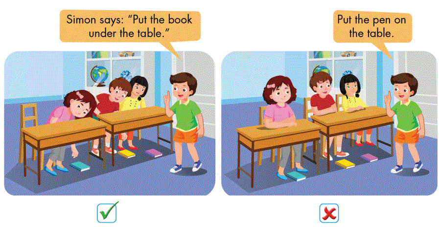 Bạn quản trò yêu cầu đặt quyển sách dưới bàn : “Simon says: Put the book under the table.”, các bạn làm theo.