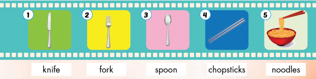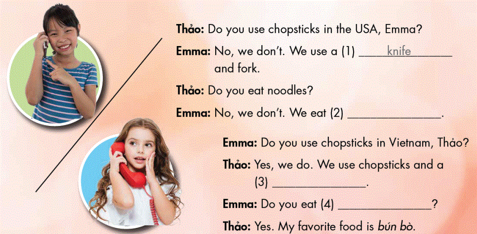 Emma: No, we don't. We use a (1) knife and fork. (Mình không. Chúng mình dùng dĩa và dao.)