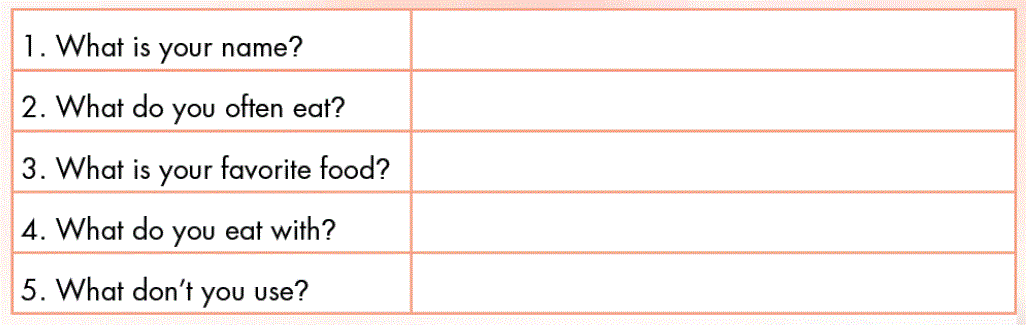 (Nhìn phần E. Bây giờ viết về việc ăn uống trong nhà bạn. Viết tầm 10 – 20 từ.)