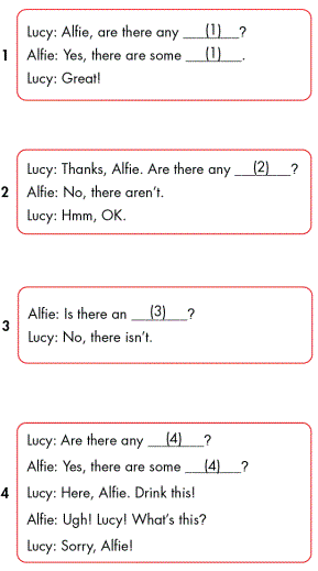 Lucy: Thanks, Alfie. Are there any (2) bananas? (Cám ơn, Alfie. Thế có quả chuối nào không?)