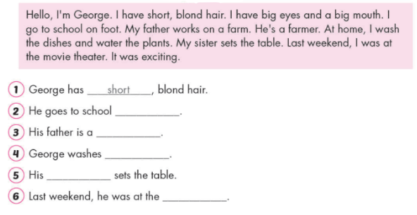 Xin chào, tôi là George. Tôi có mái tóc ngắn và vàng. Tôi có đôi mắt to và cái miệng rộng. Tôi đi bộ đến trường. Bố của tôi làm việc tại nông trại. Ông ấy là nông dân. Ở nhà, tôi rửa bát và tưới cây. Chị gái tôi dọn bàn. Cuối tuần trước, tôi đã đến rạp chiếu phim. Nó thật thú vị.