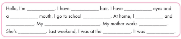 Hello, I’m Minh. I have long, black hair. I have small eyes and a big mouth. I go to school by motorbike. At home, I carry bags and put away groceries. My brother walks the dog. My mother works at a hospital. She is a doctor. Last weekend, I was at the playground. It was fun.