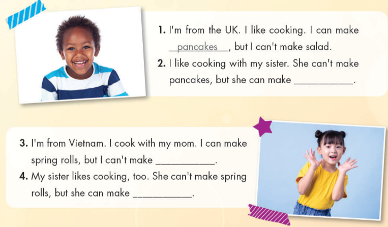 4. My sister likes cooking, too. She can’t make spring rolls, but she can make pasta.