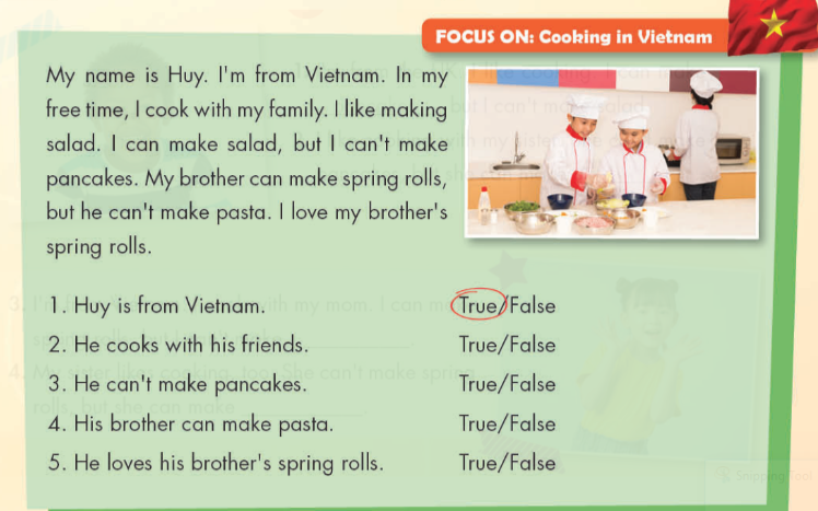 My name is Huy. I’m from Vietnam. In my free time, I cook with my family. I like making salad. I can make salad, but I can’t make pancakes. My brother can make spring rolls, but he can’t make pasta. I love my brother’s spring rolls.