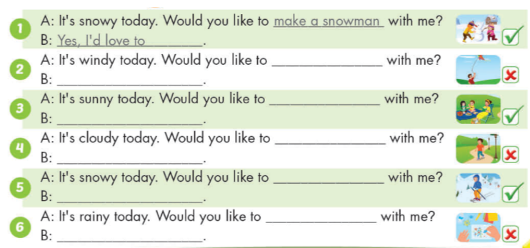 (A: Hôm nay trời có tuyết. Bạn có muốn làm người tuyết cùng với tớ không?