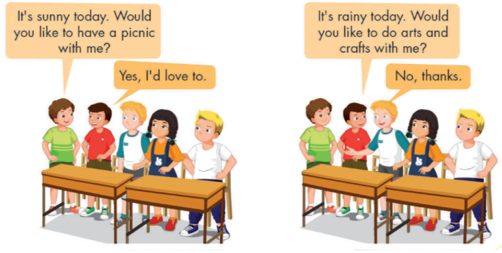 (Hôm nay trời nắng. Bạn có muốn đi dã ngoại với tớ không?
