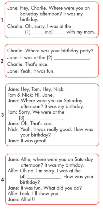4. Jane: Alfie, where were you on Saturday afternoon? It was my birthday.