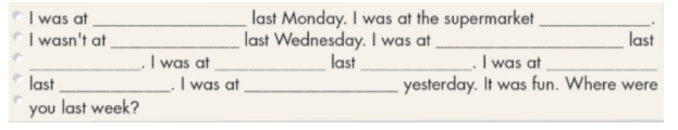 I was at the playground last Monday. I was at the supermarket last Tuesday. I wasn’t at the park last Wednesday. I was at the movie theater last Thursday. I was at the mall last Friday. I was at the zoo last Saturday. I was at the swimming pool yesterday. It was fun. Where were you last week?