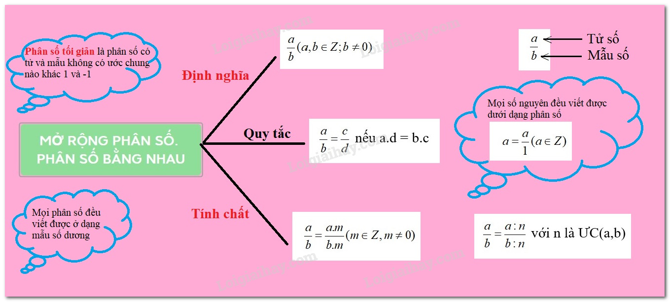 $\dfrac{a}{b} = \dfrac{{a.m}}{{b.m}}$ với $m \in Z$ và $m \ne 0$; $\dfrac{a}{b} = \dfrac{{a:n}}{{b:n}}$với $n \in $ ƯC$\left( {a;b} \right)$.