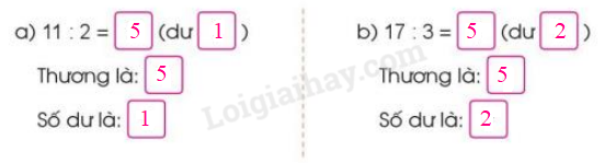 Thực hiện phép chia để tìm thương và số dư rồi điền số thích hợp vào ô trống.