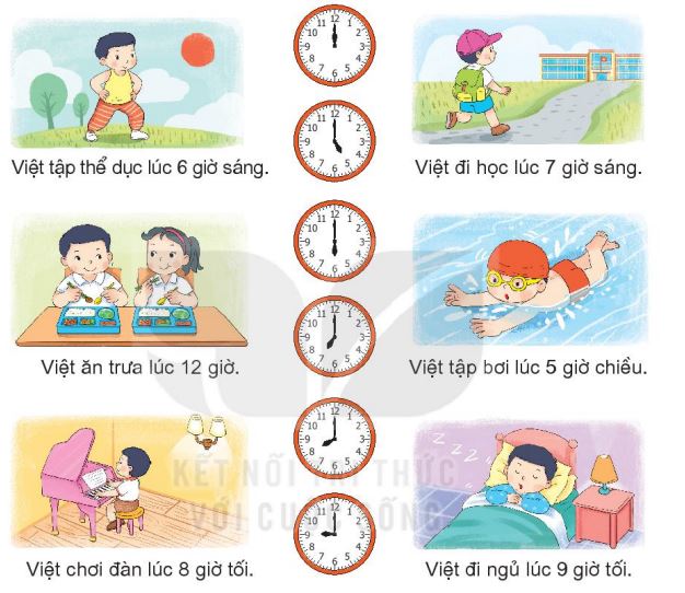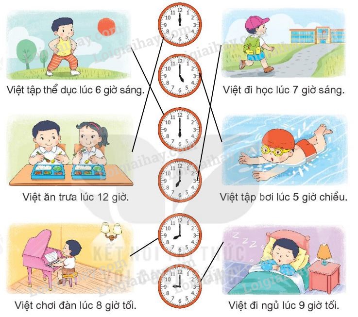 Quan sát tranh từ đó nối từng bức tranh với đồng hồ thích hợp.