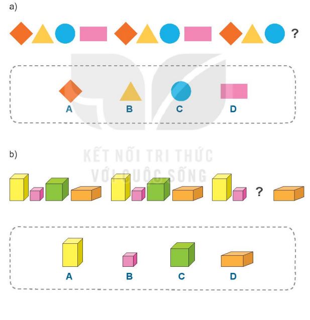 b) Quy luật: Hình hộp chữ nhật màu vàng; Hình lập phương màu tím; Hình lập phương màu xanh; Hình hộp chữ nhật màu cam.