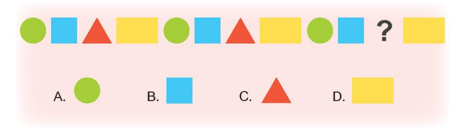 Các hình sắp xếp theo thứ tự: Hình tròn, hình vuông, hình tam giác, hình chữ nhật rồi tiếp tục lặp lại như vậy.